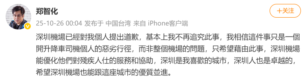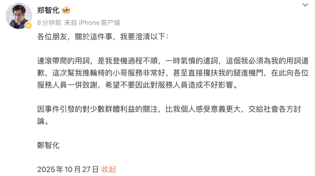 10月27日,郑智化再次发文回应深圳机场事件,并就自己用词不当致歉。